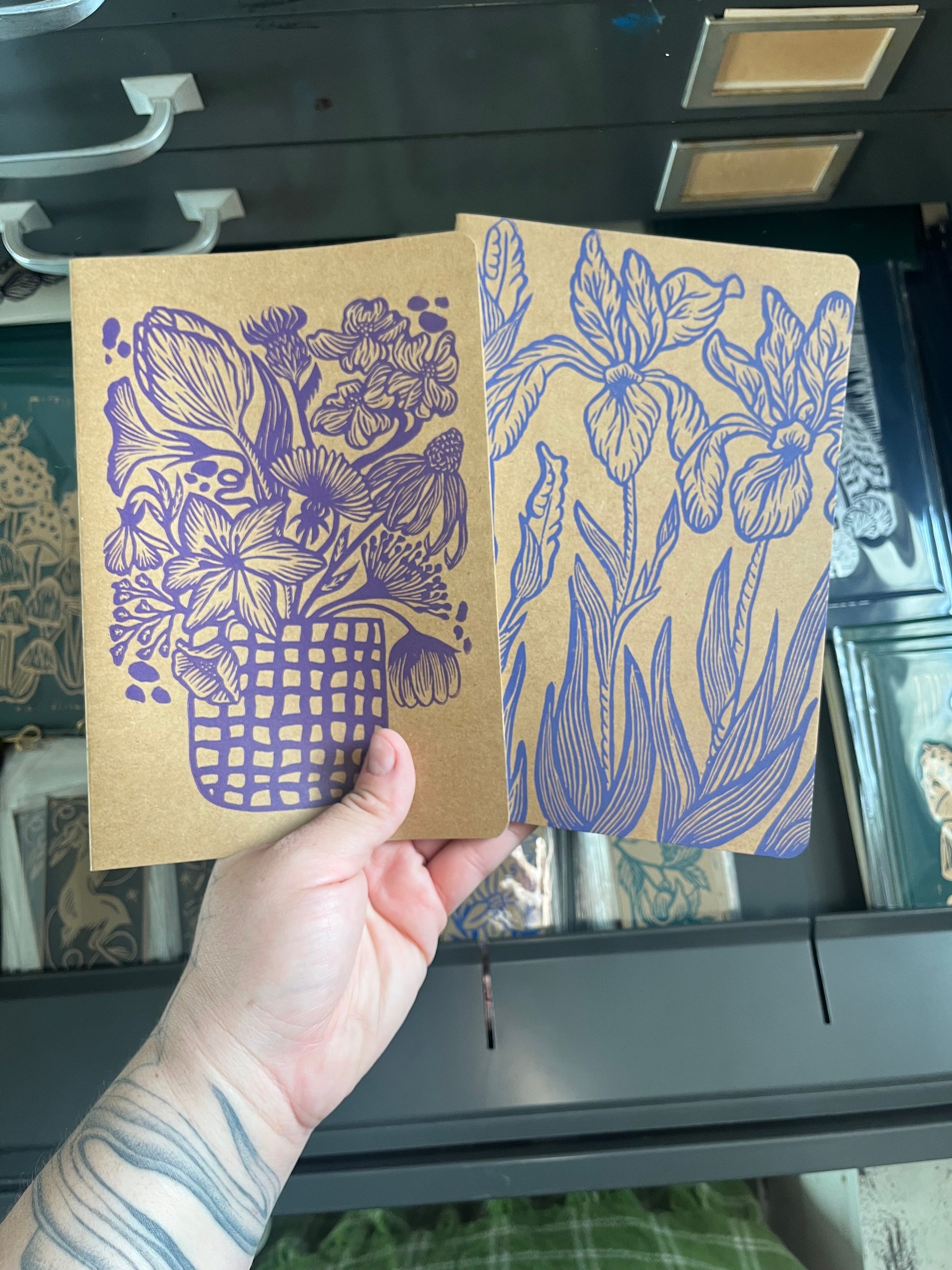 "Blossom Journal” is an A5 size journal with a kraft-colored cover and a hand-carved linoleum block print on the cover featuring a print of a flower bouquet of dogwood, tulip, queen anne’s lace , echinacea, thistle, poppies, morning glory and more. These kraft notebooks are all blank inside with 60 lined pages, which would be convenient for daily usage. There’s a “date/page” column on the top of every page.