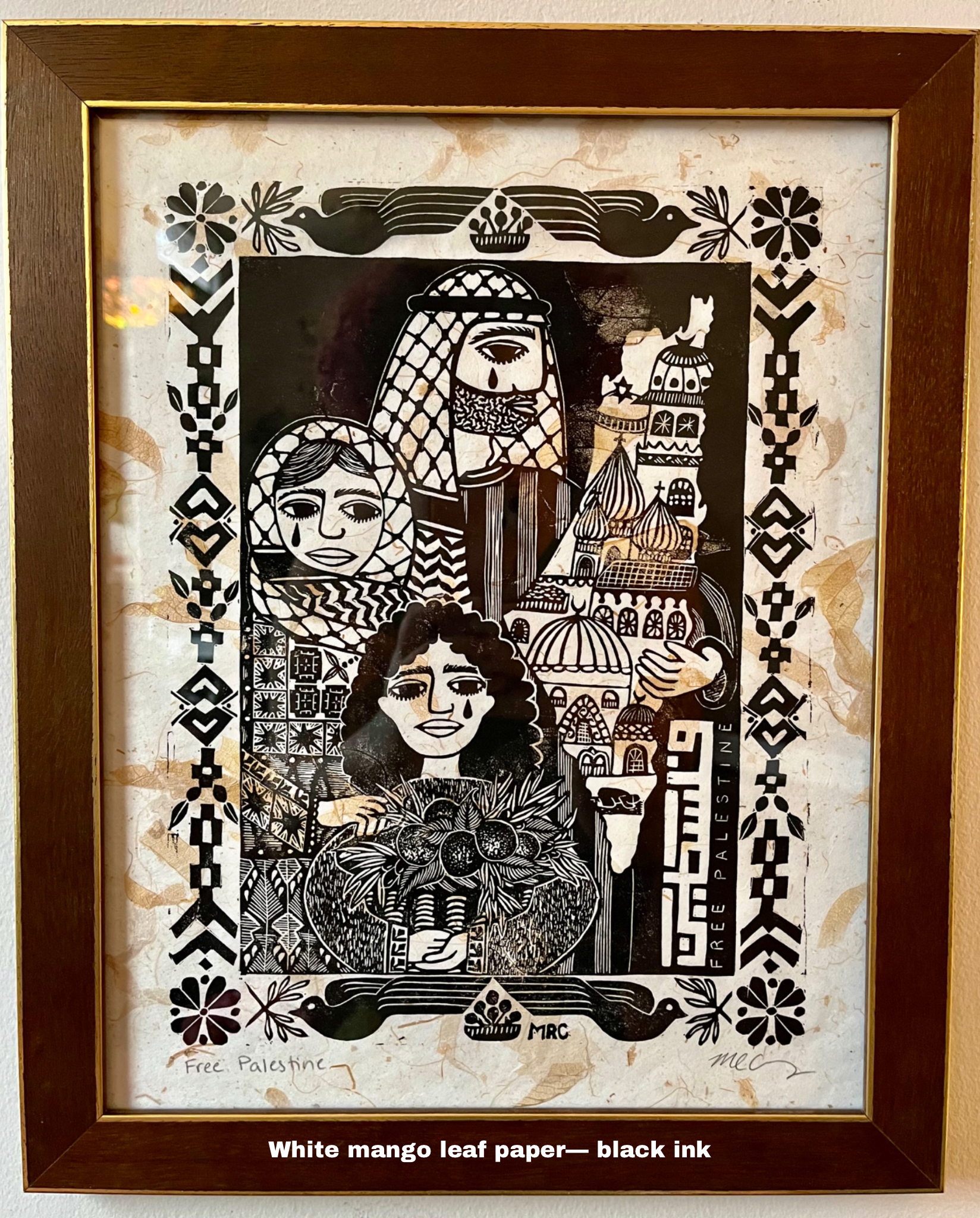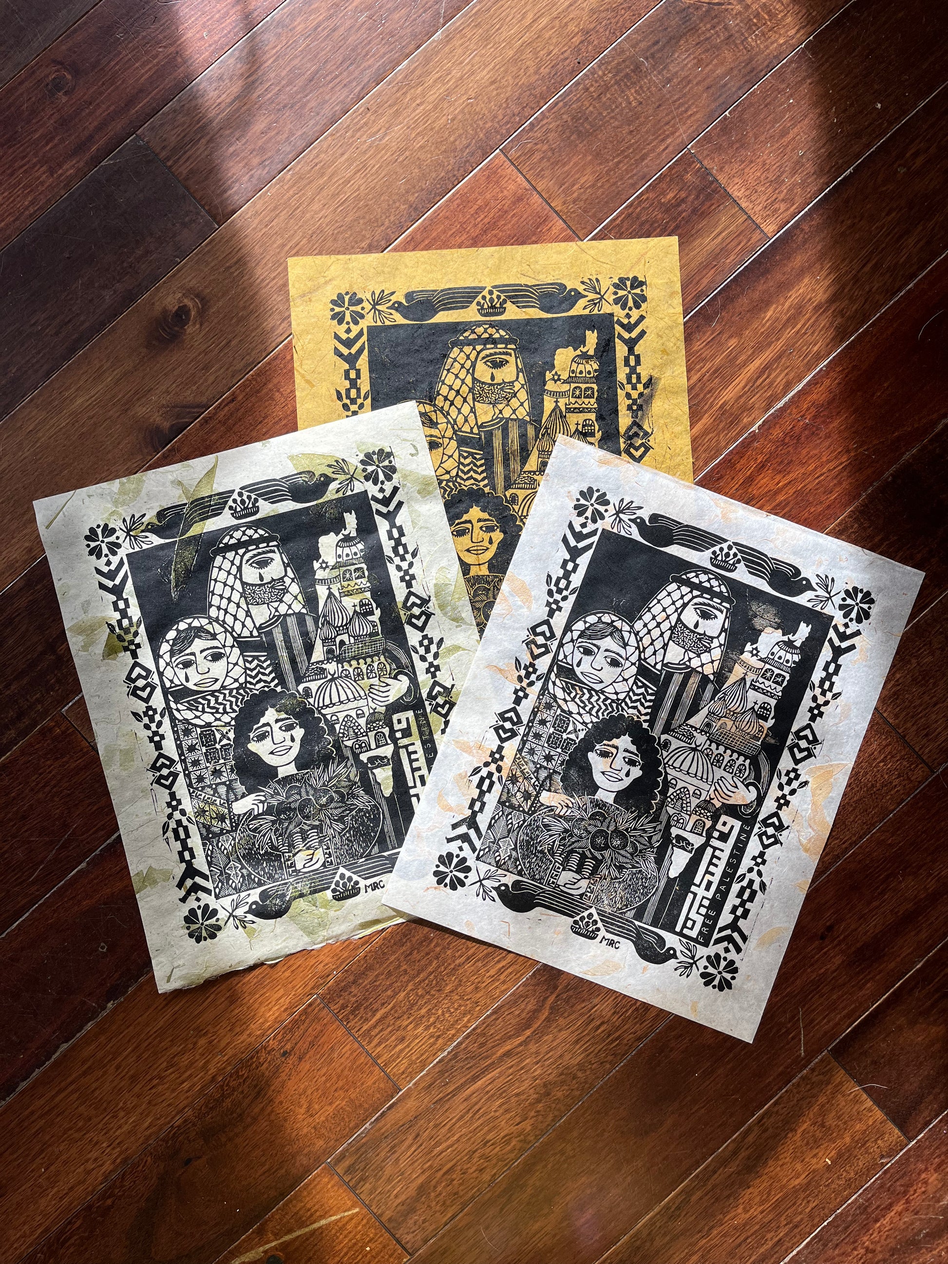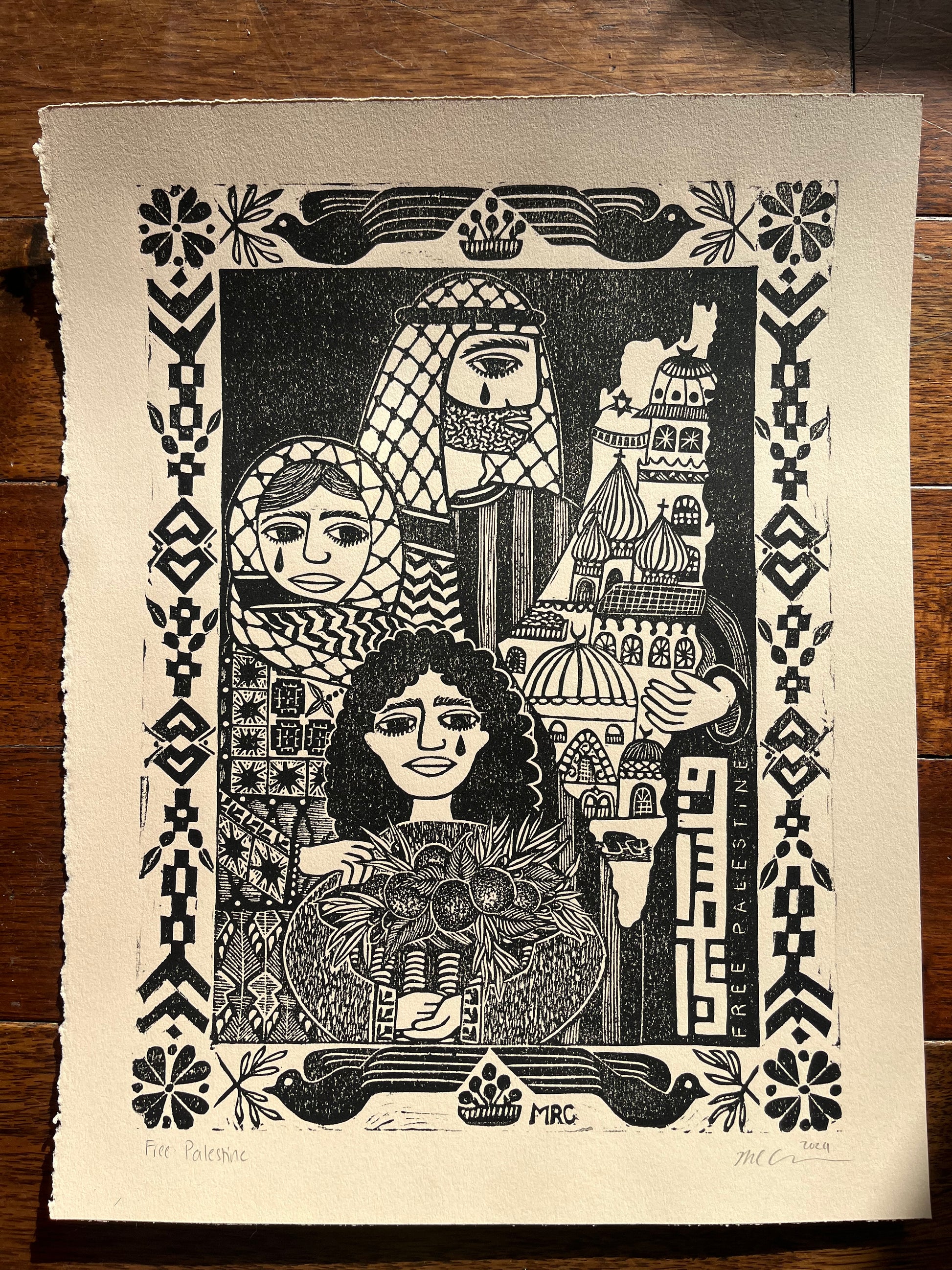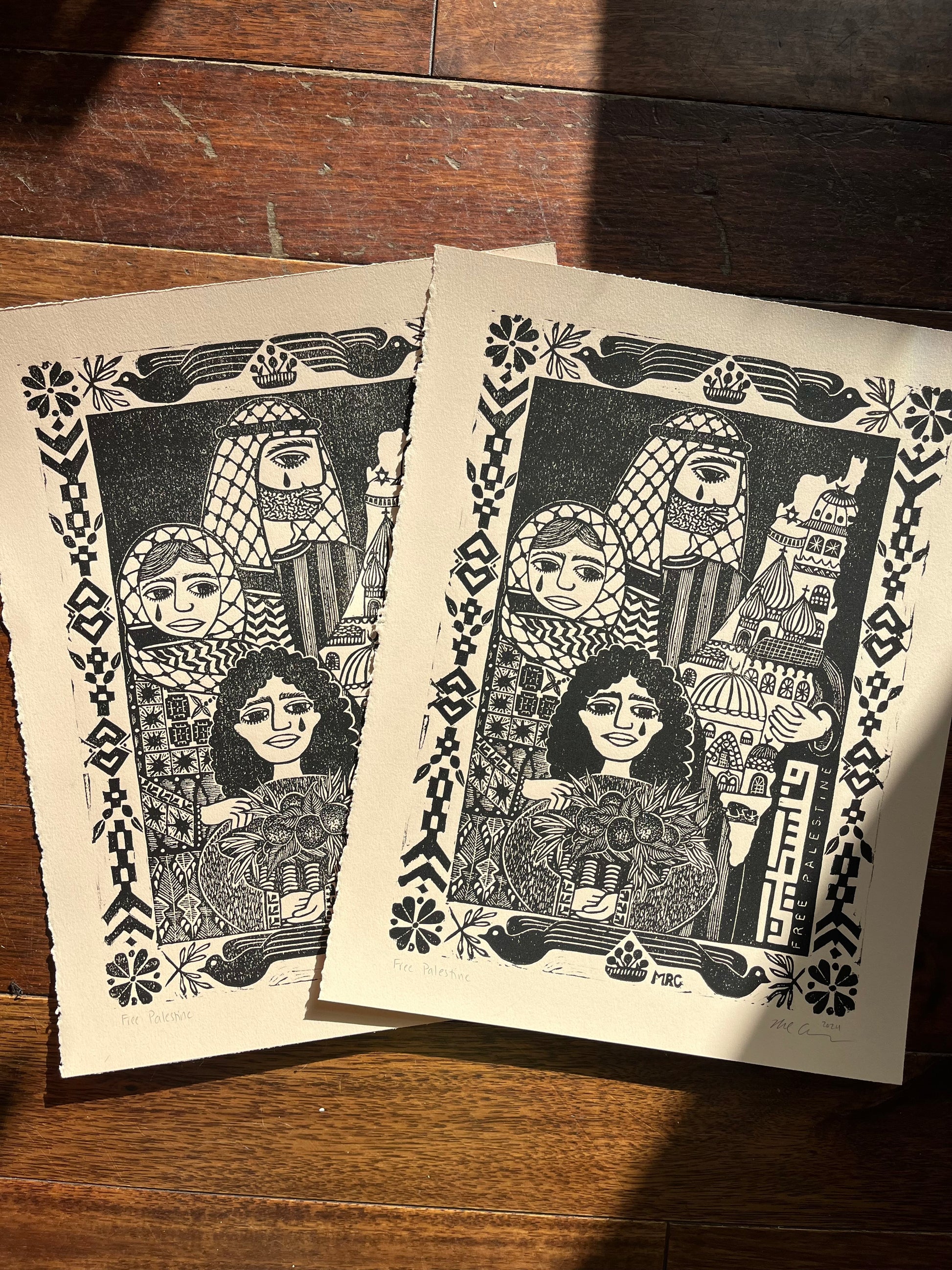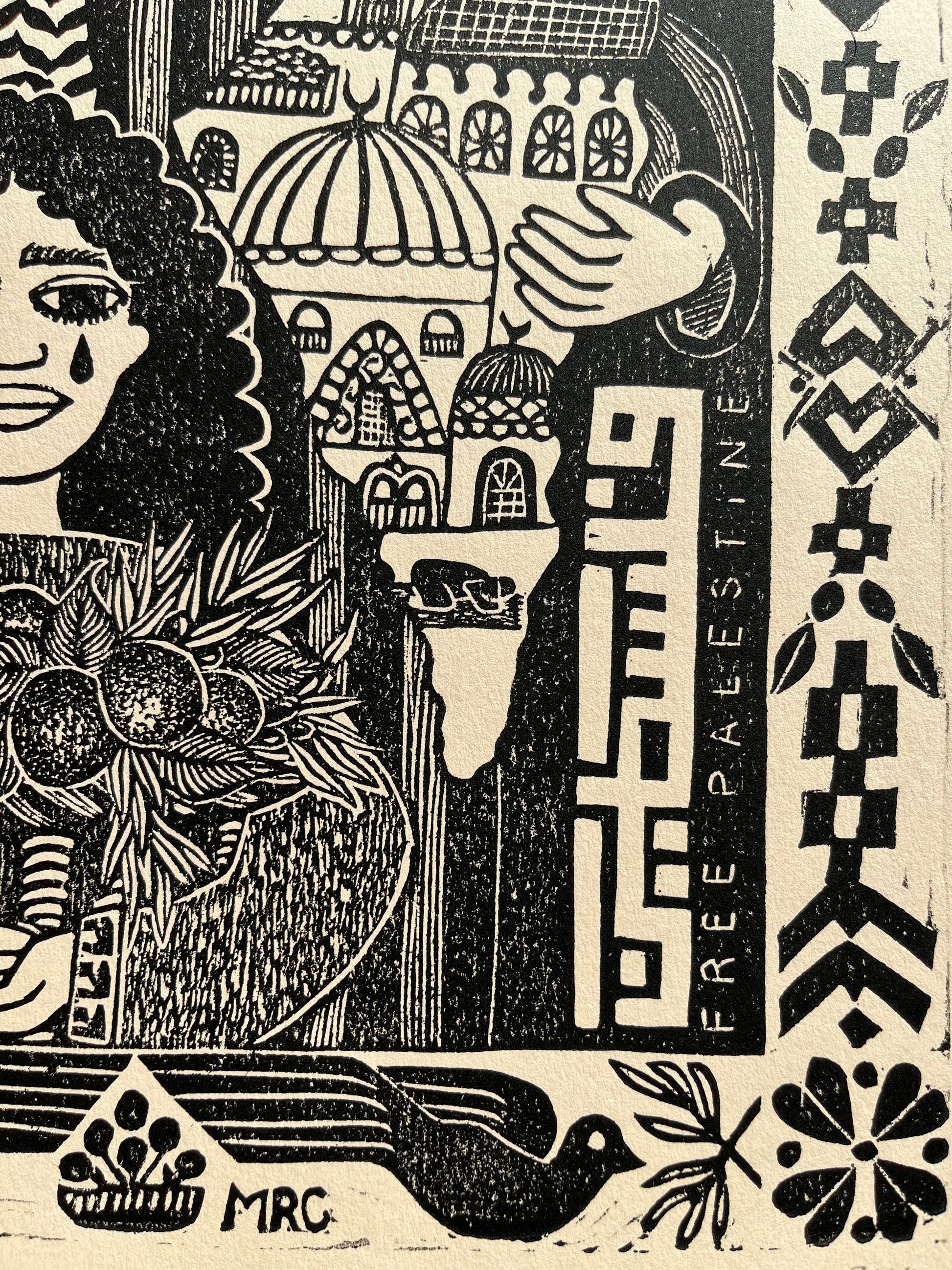 Free Palestine is a 9x11'' hand-carved linoleum block-print printed in a varied edition on 11x14 handmade papers including-- white mango fiber paper (black ink), green mango fiber paper (black ink), yellow ochre thai banana leaf paper (black ink), kraft colored Stonehenge paper (black ink), fawn colored Stonehenge paper (black ink), and chocolate brown thai banana leaf paper (gold ink).