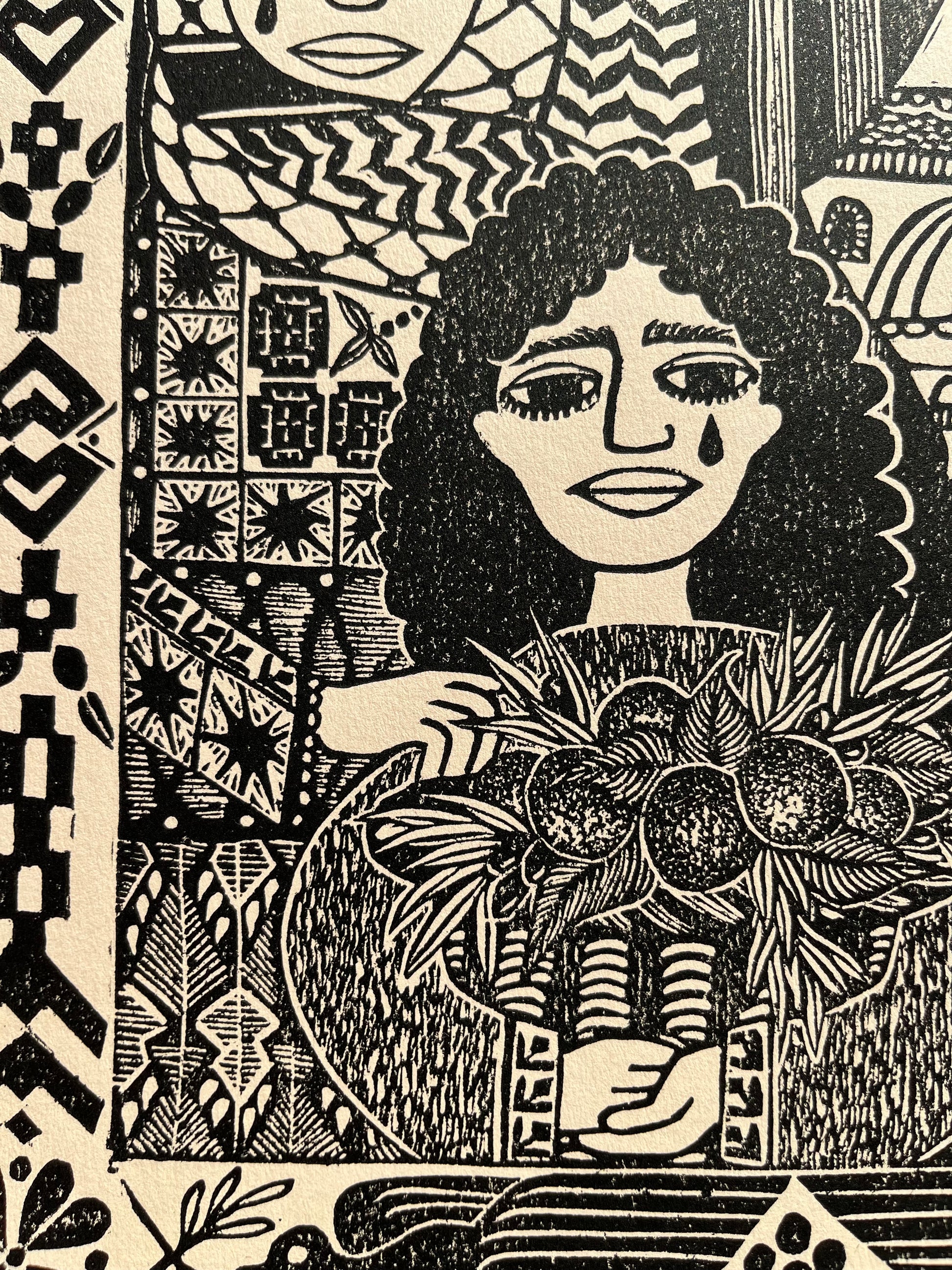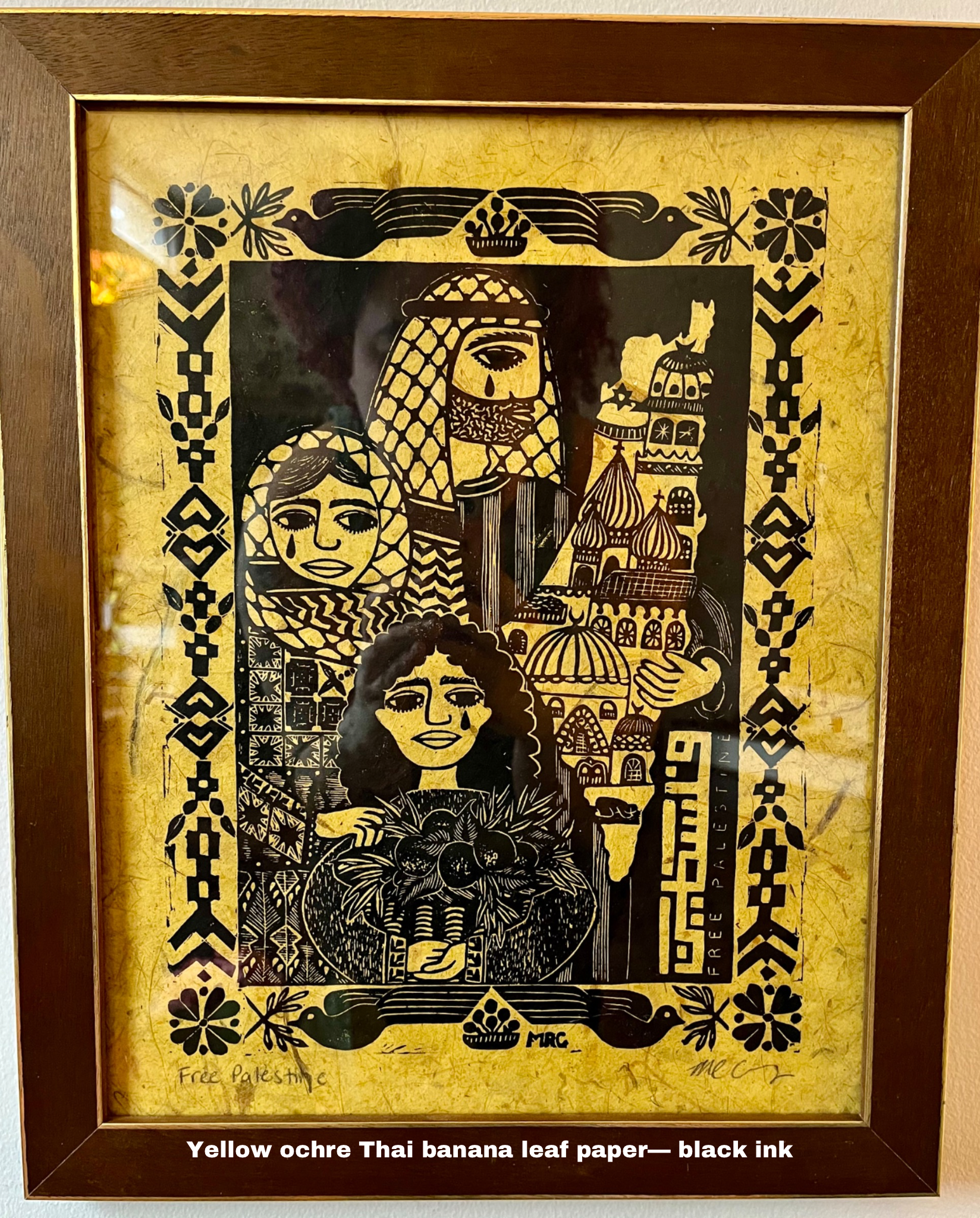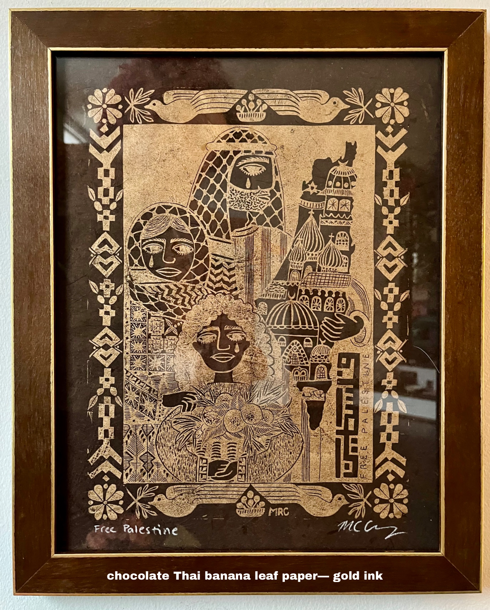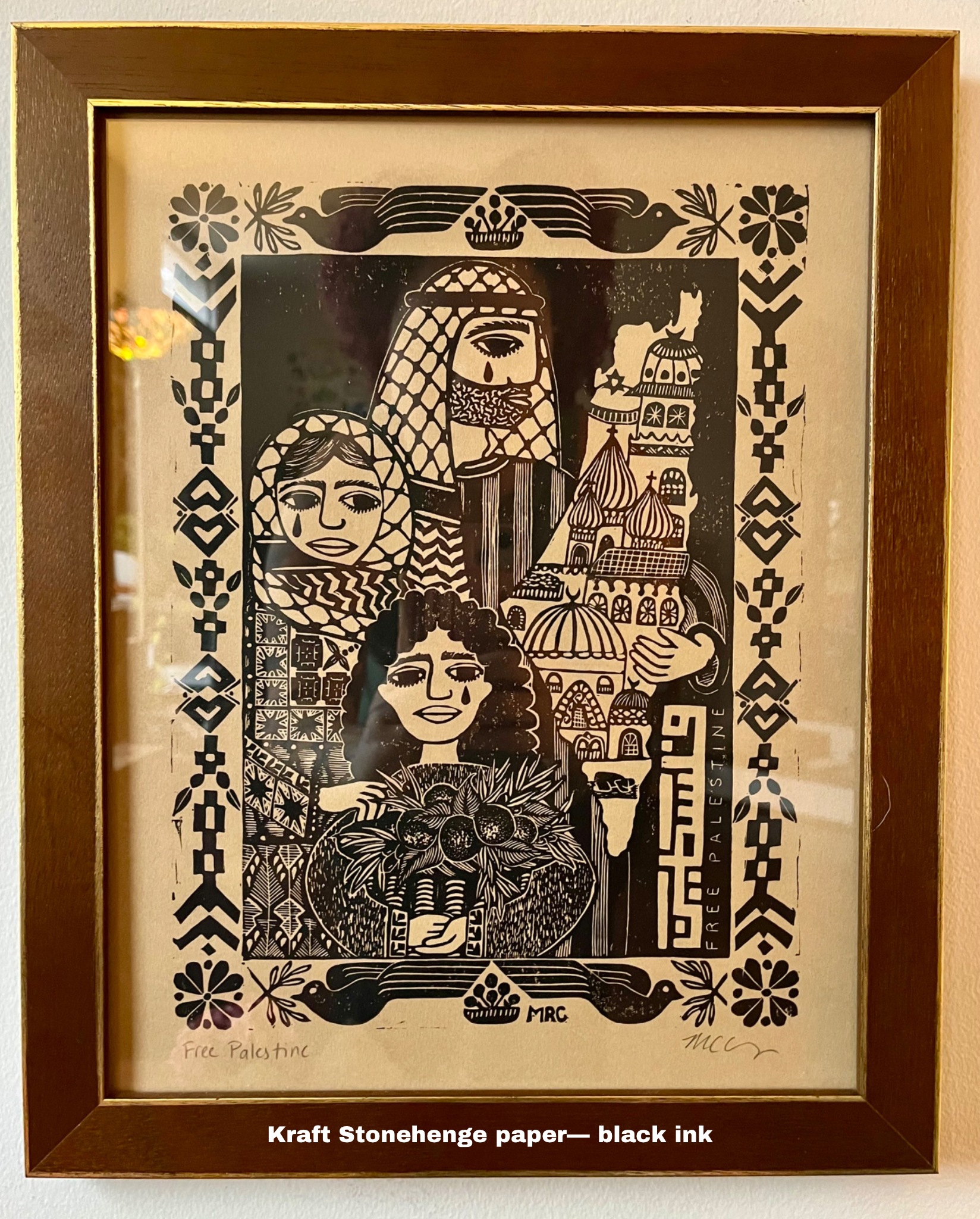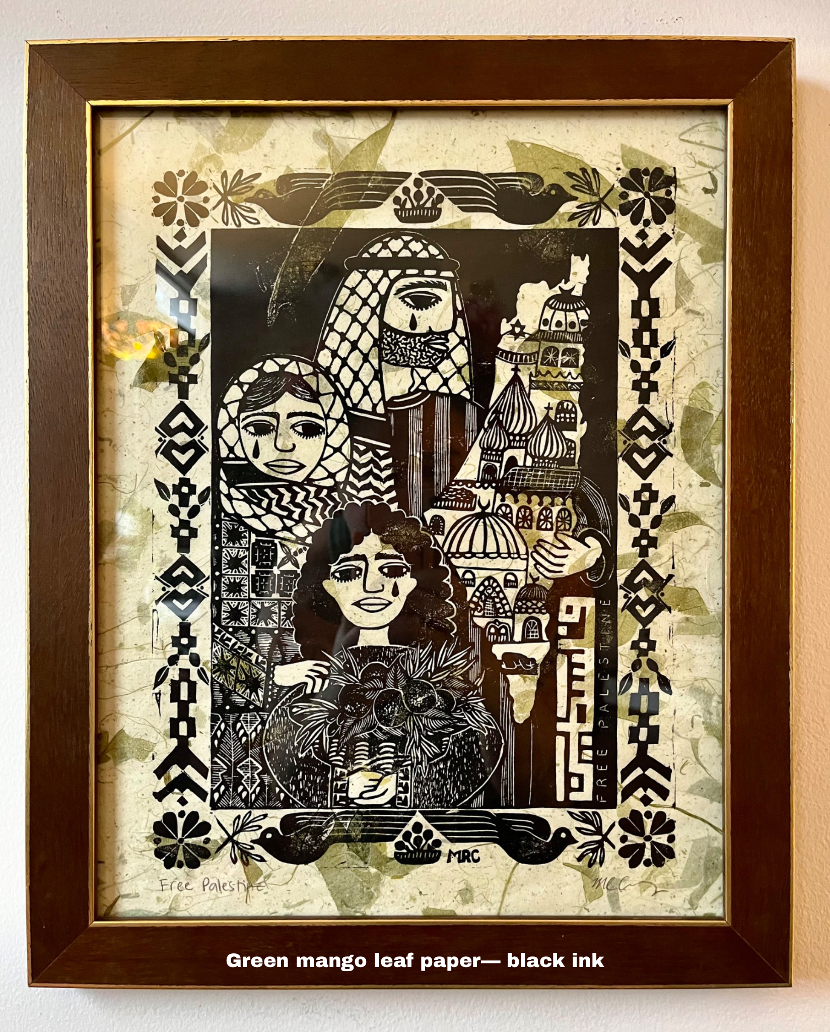 Free Palestine is a 9x11'' hand-carved linoleum block-print printed in a varied edition on 11x14 handmade papers including-- white mango fiber paper (black ink), green mango fiber paper (black ink), yellow ochre thai banana leaf paper (black ink), kraft colored Stonehenge paper (black ink), fawn colored Stonehenge paper (black ink), and chocolate brown thai banana leaf paper (gold ink).