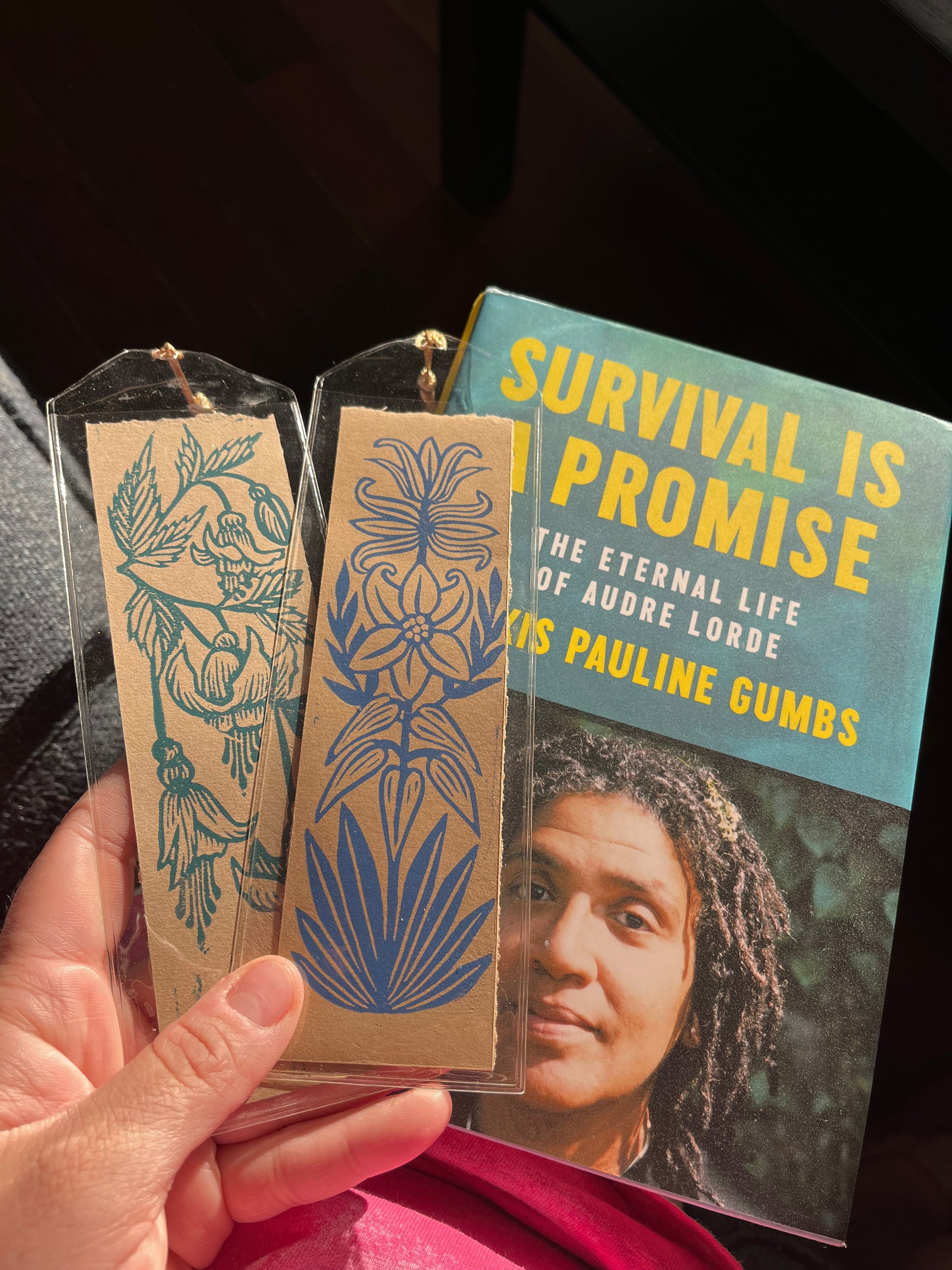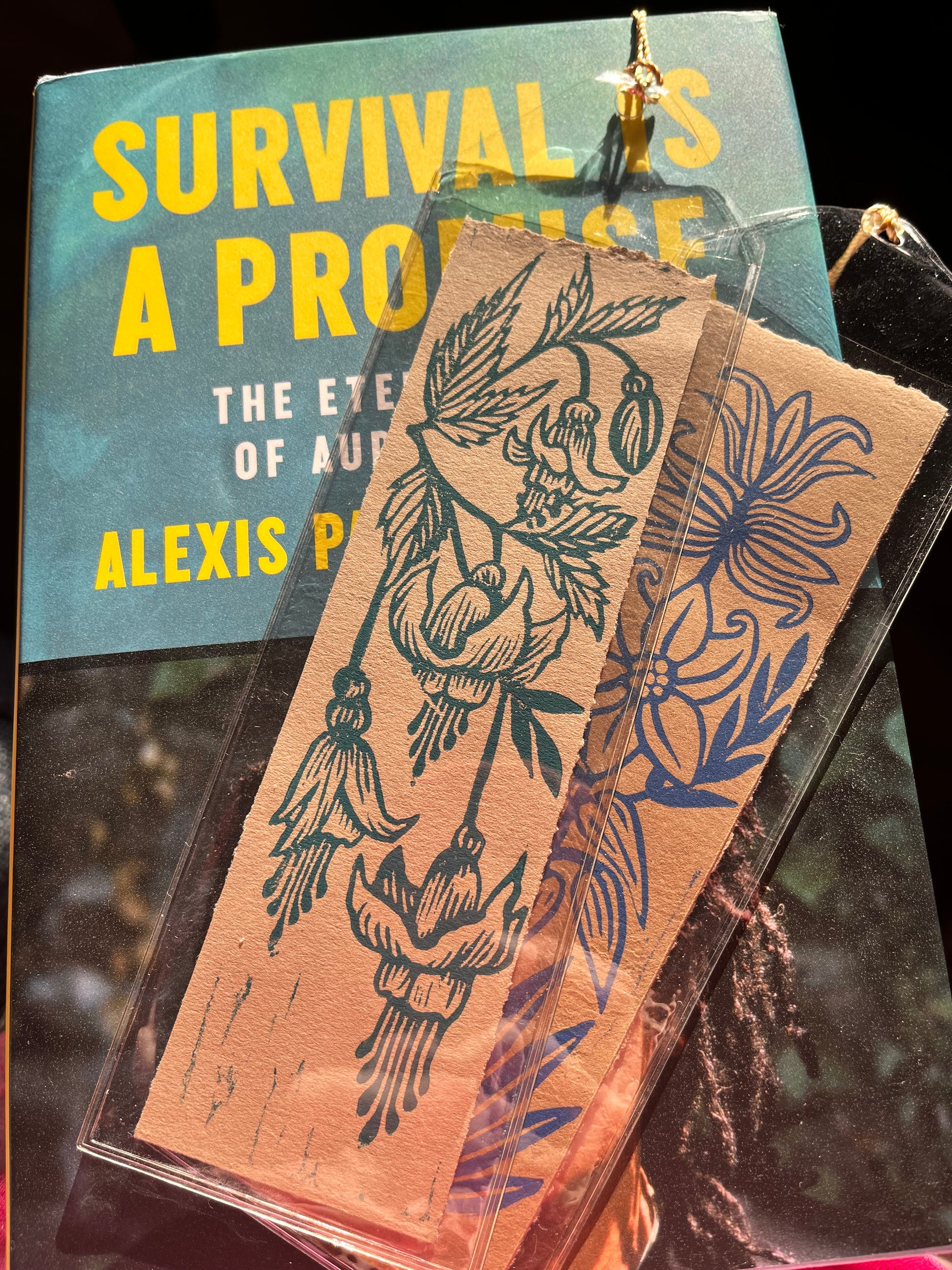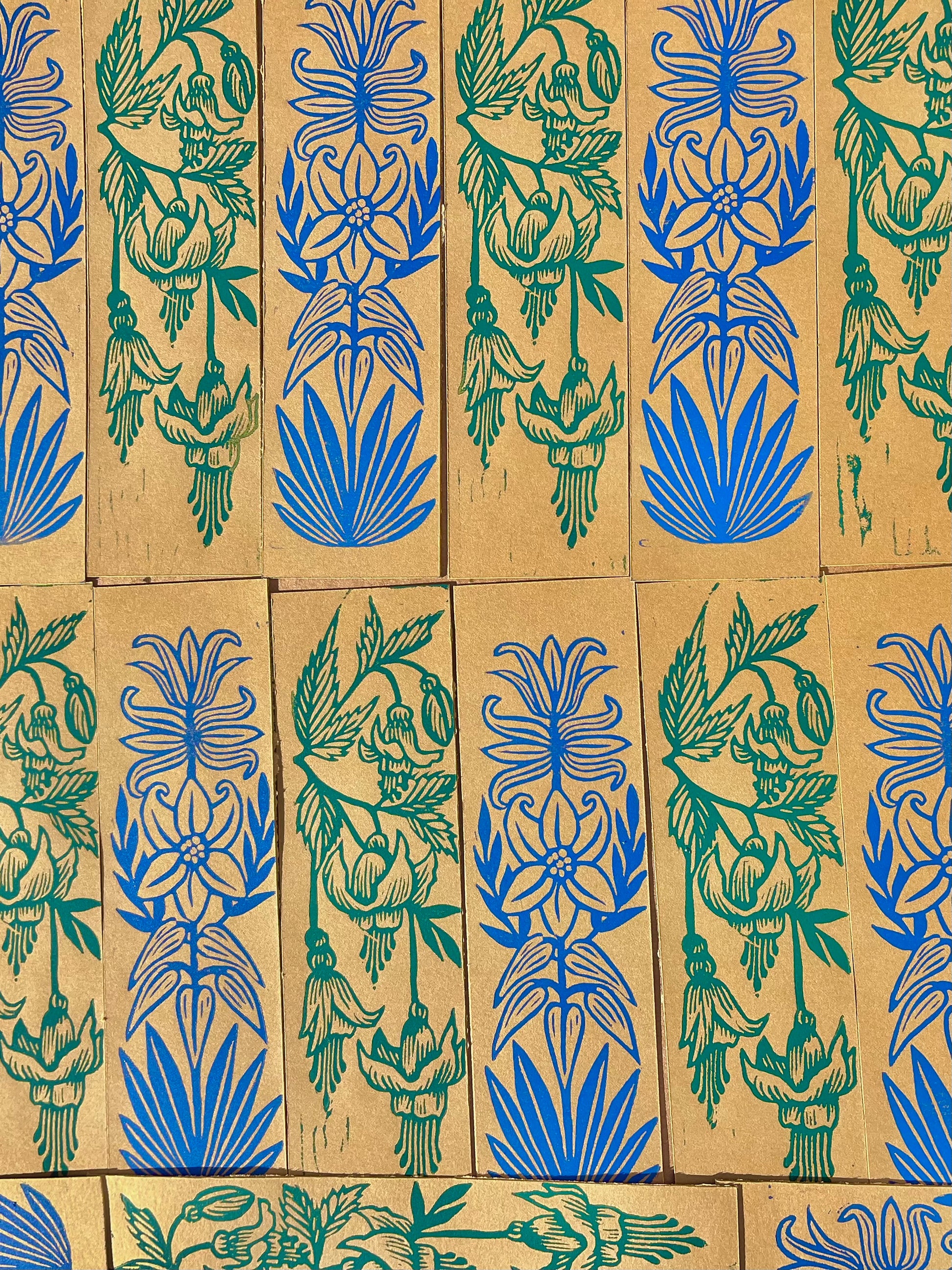 These bookmarks are all made from hand-carved and printed linoleum block prints! Bookmarks have designs on a single side and are placed within a clear vinyl protective sheath and decorated with a gold tassel. Each one is hand-printed from larger linoleum blocks and may vary slightly from the pictures, but they are indeed printed within the same edition. These are the perfect gift to the reader in your life!