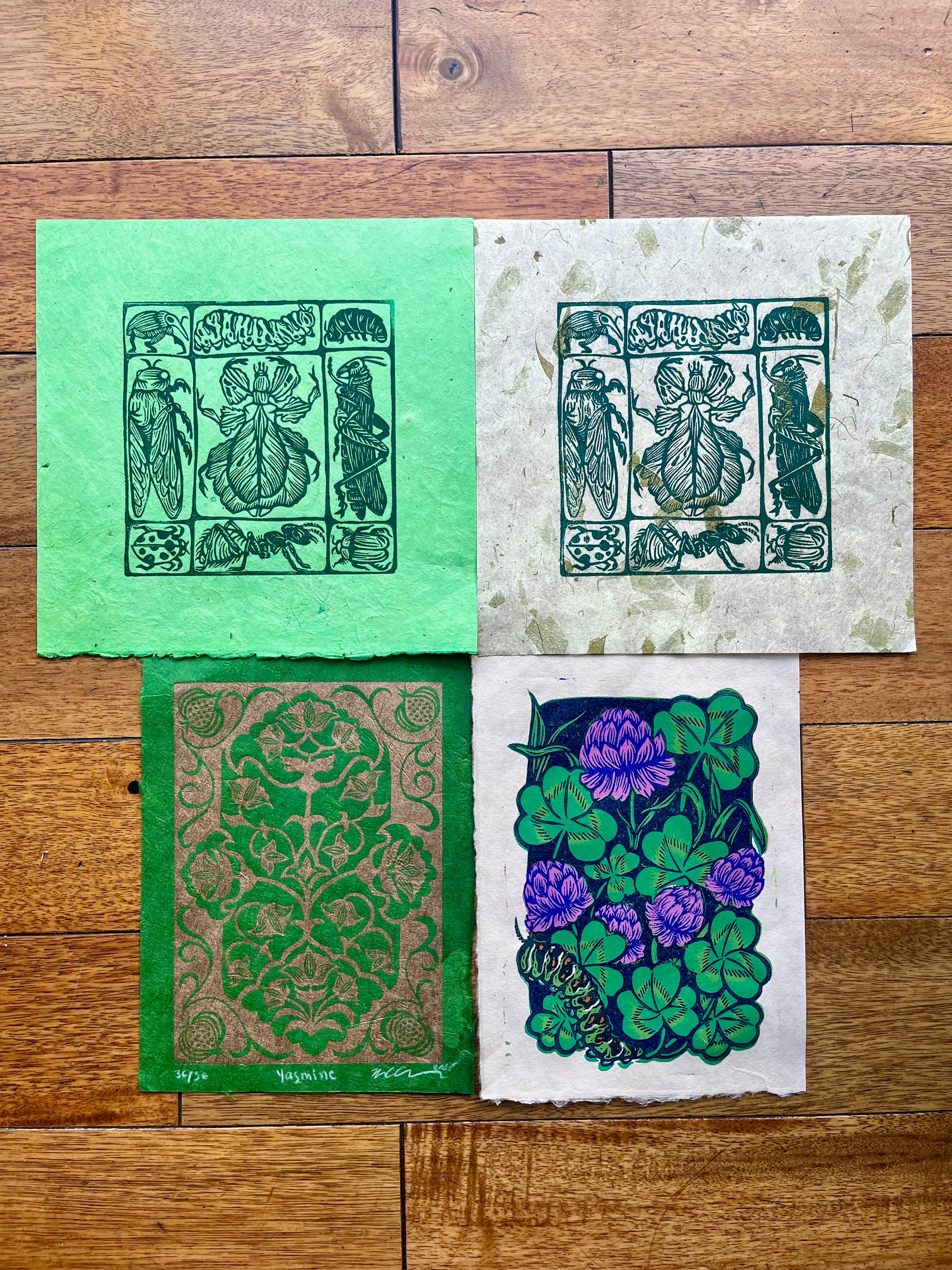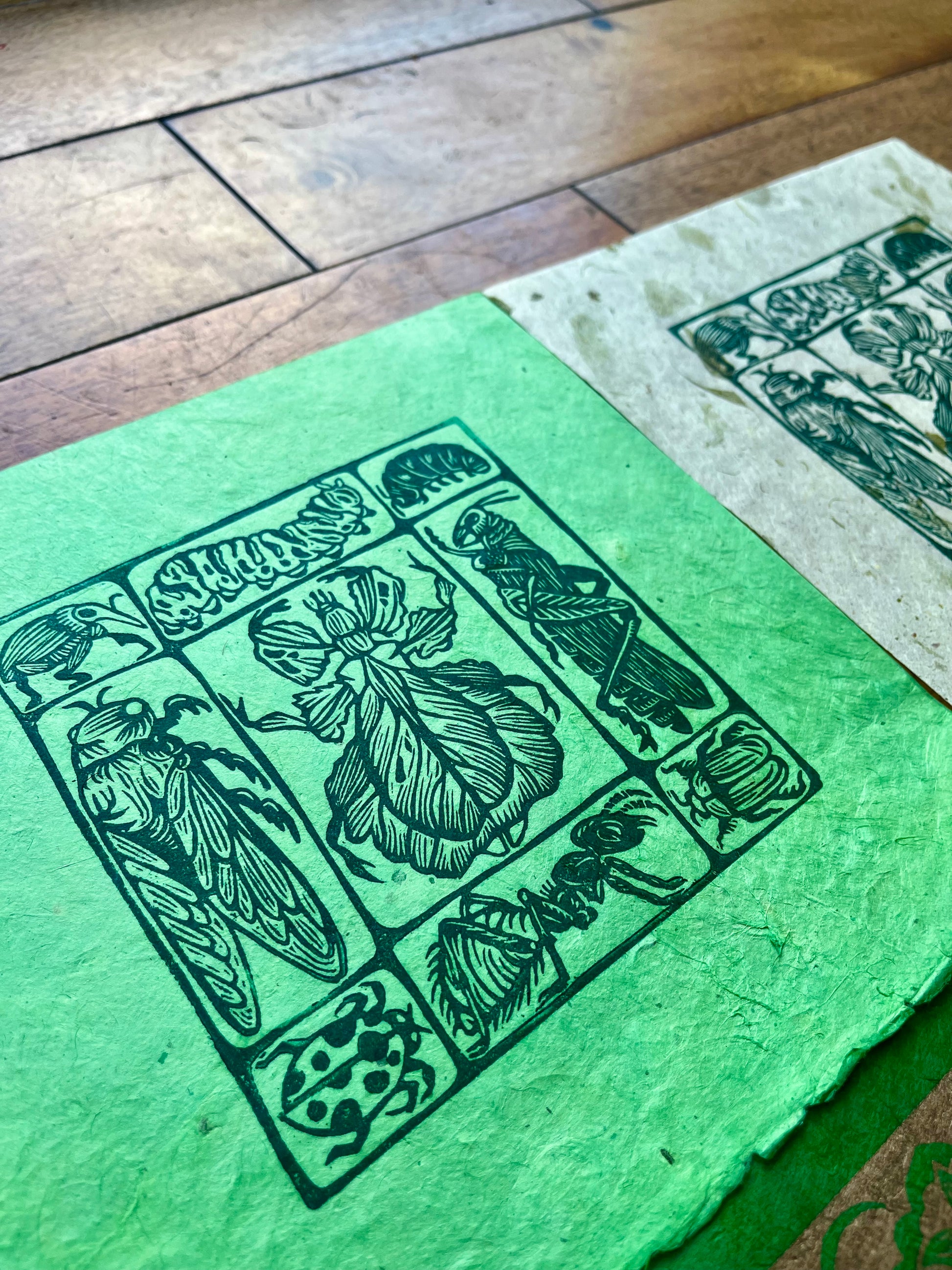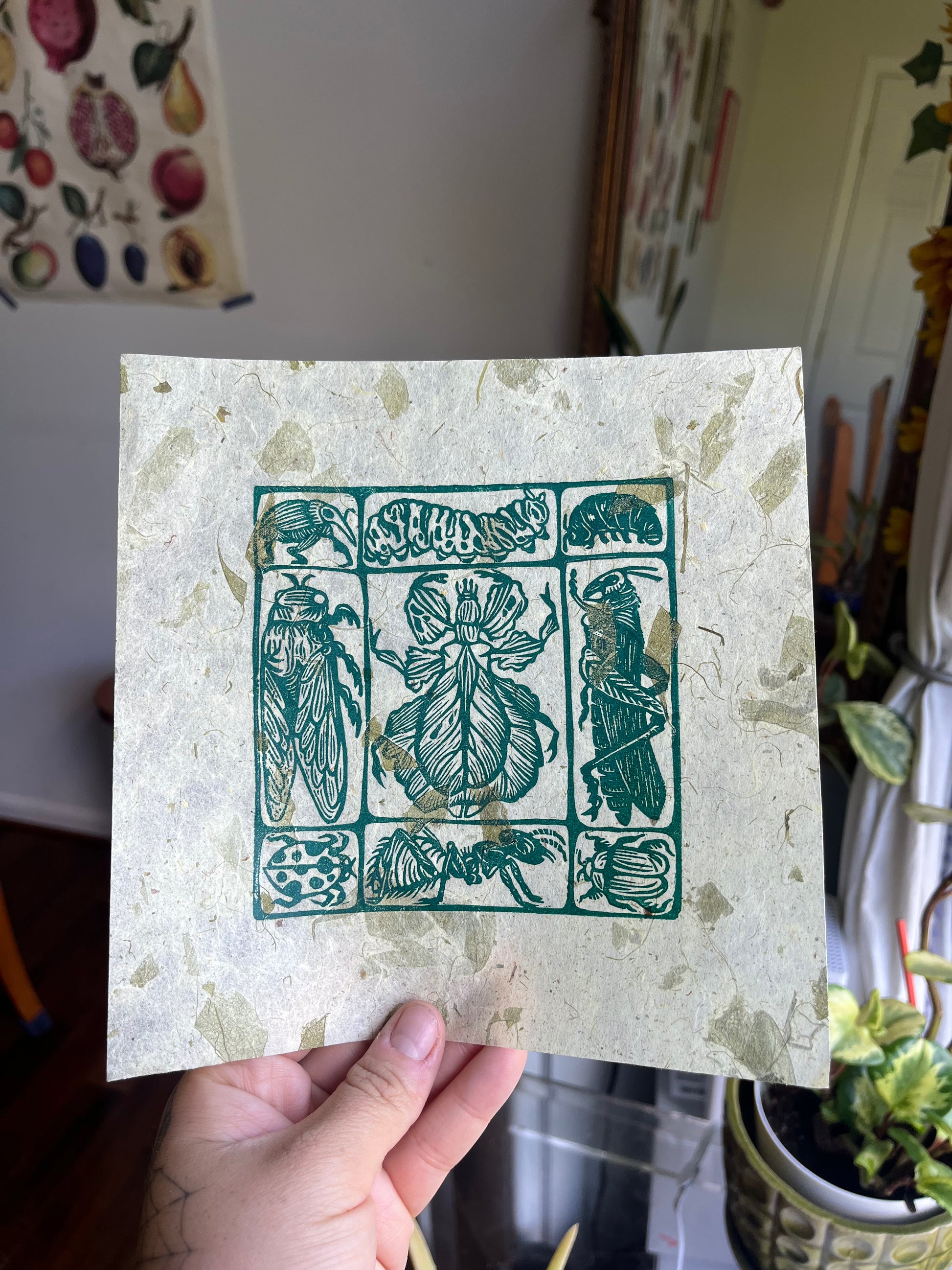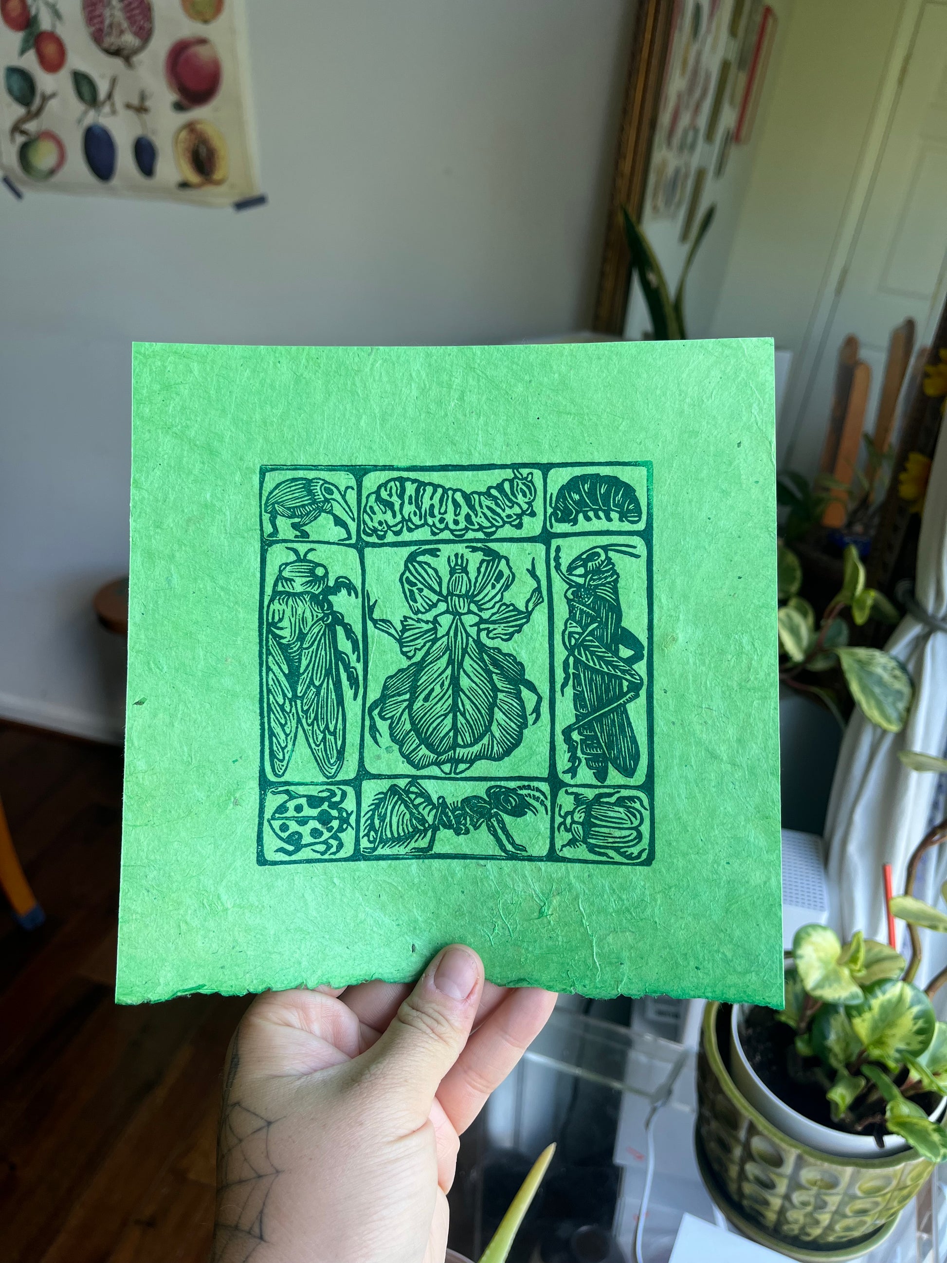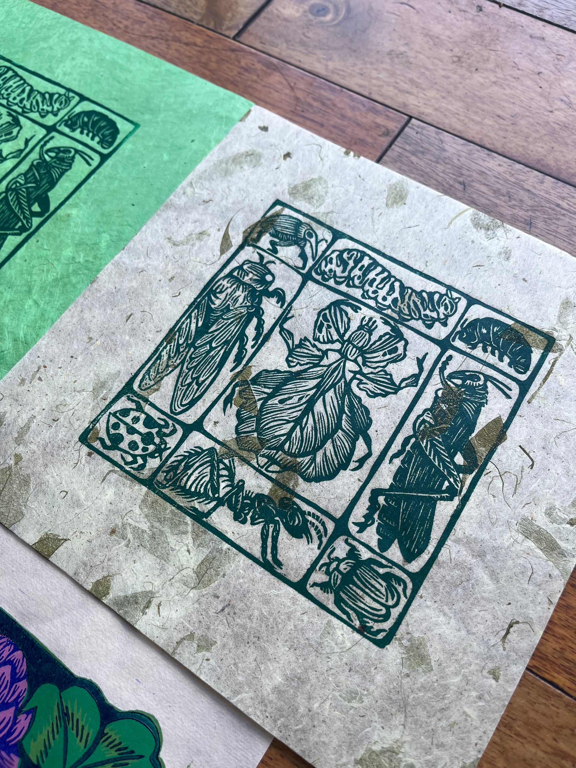 The Bug Collector is a 6x6" hand-carved linoleum block print on 8x8" paper made in two variations: Green Ink on spring green lokta paper and Green ink on green mango leaf paper. These prints are in an open edition and will be reprinted as many times as the artist chooses. All prints are signed, dated, and labled "OE" for open edition.