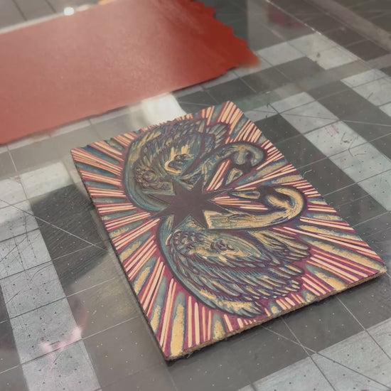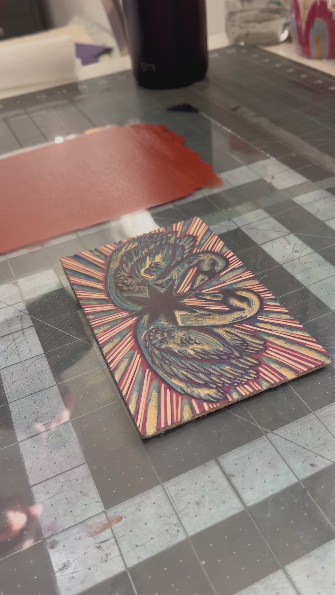 Fate is a 5x7" hand carved linoleum block print made in burnt sienna oil-based ink on handmade Thai banana leaf paper. Each print is signed, dated, and numbered out of 70.