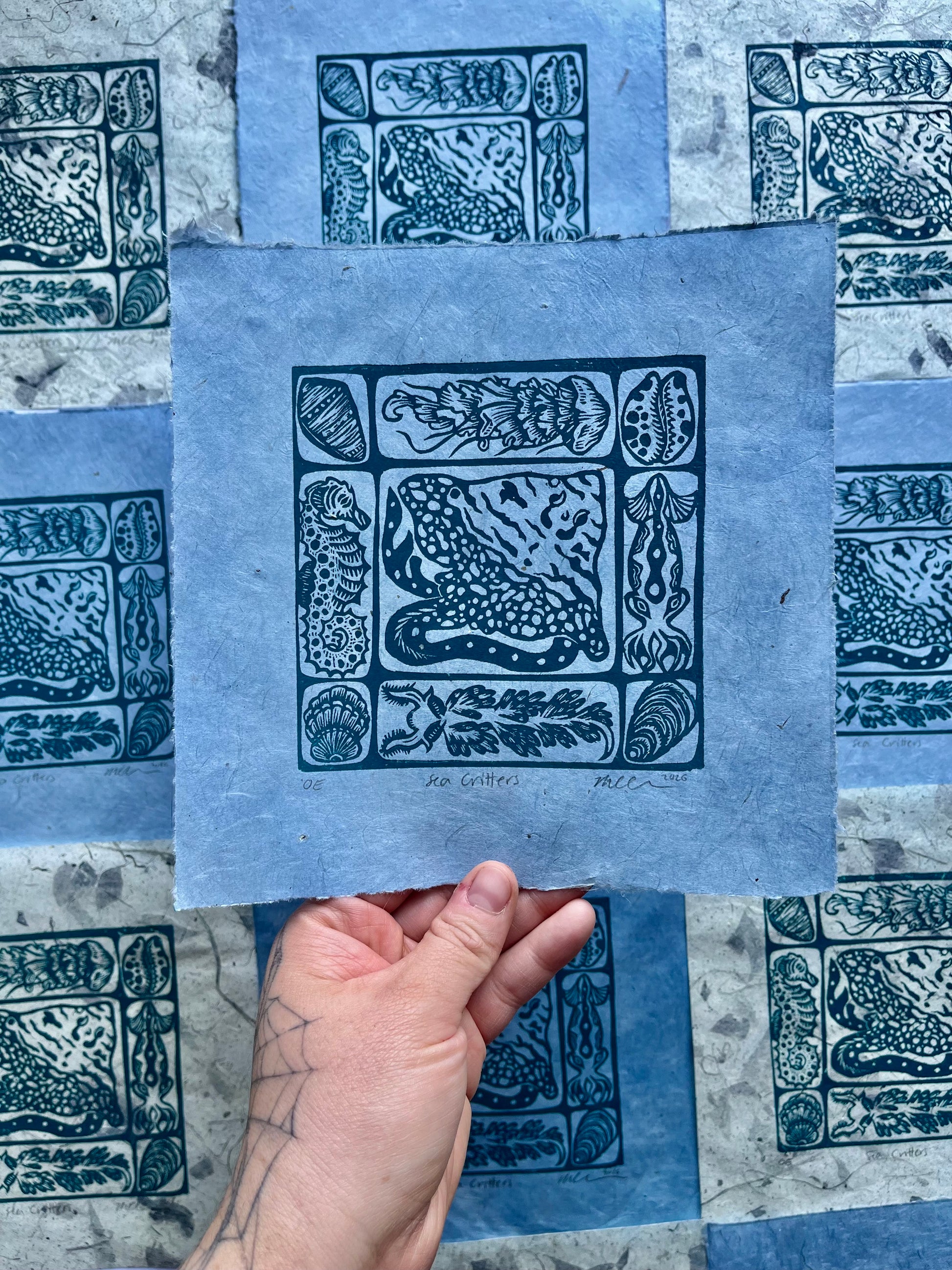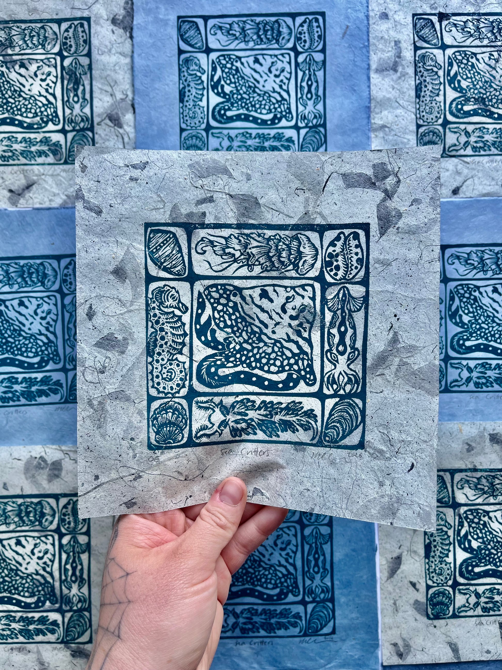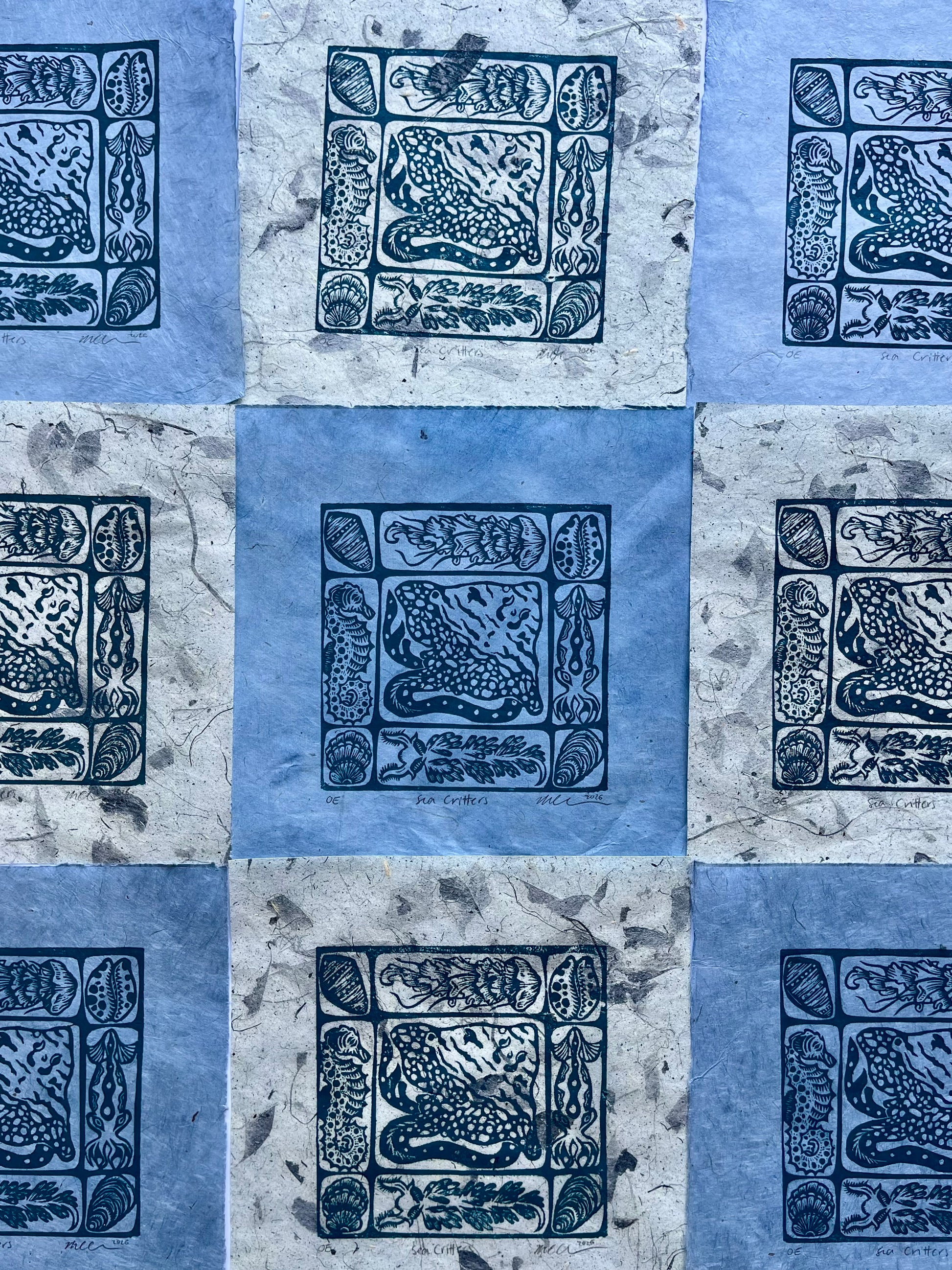 Sea Critters is a 6x6" hand-carved linoleum block print on 8x8" paper made in two variations: Teal Ink on pale blue handmade Lokta paper and teal ink on handmade slate blue mango leaf paper. These prints are in an open edition and will be reprinted as many times as the artist chooses. All prints are signed, dated, and labled "OE" for open edition.