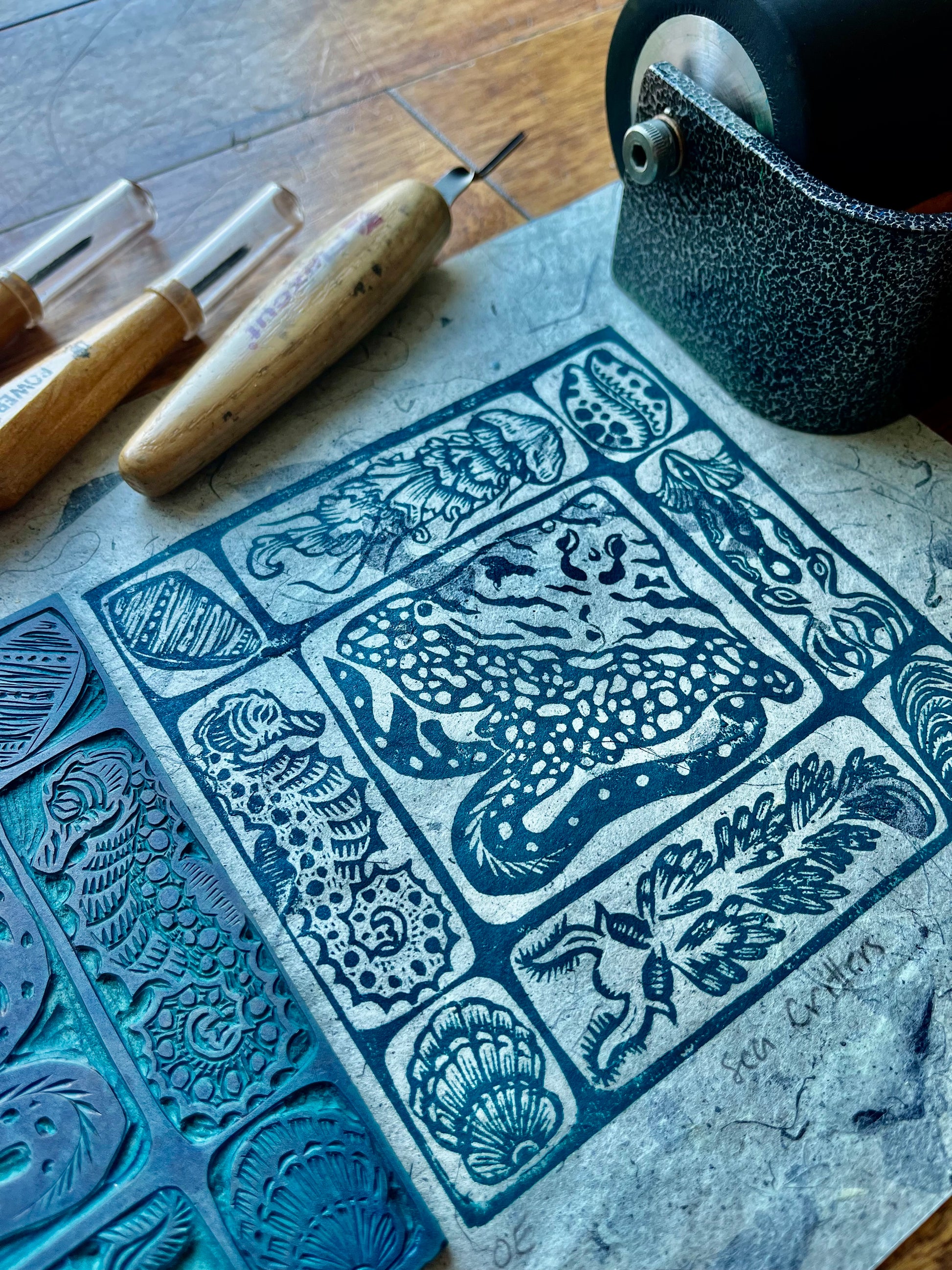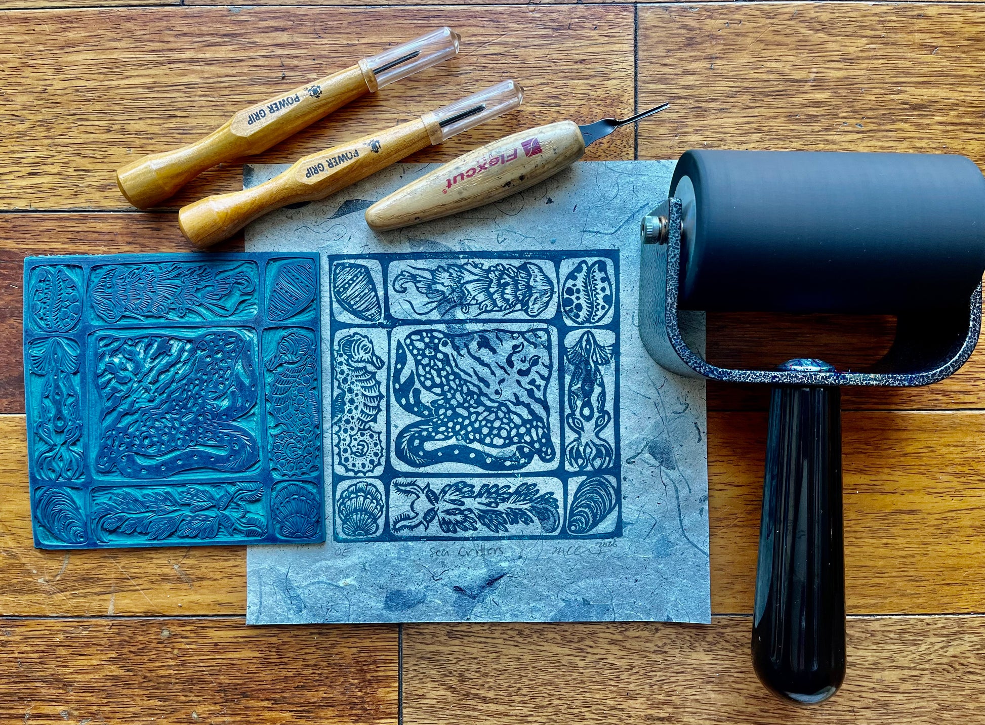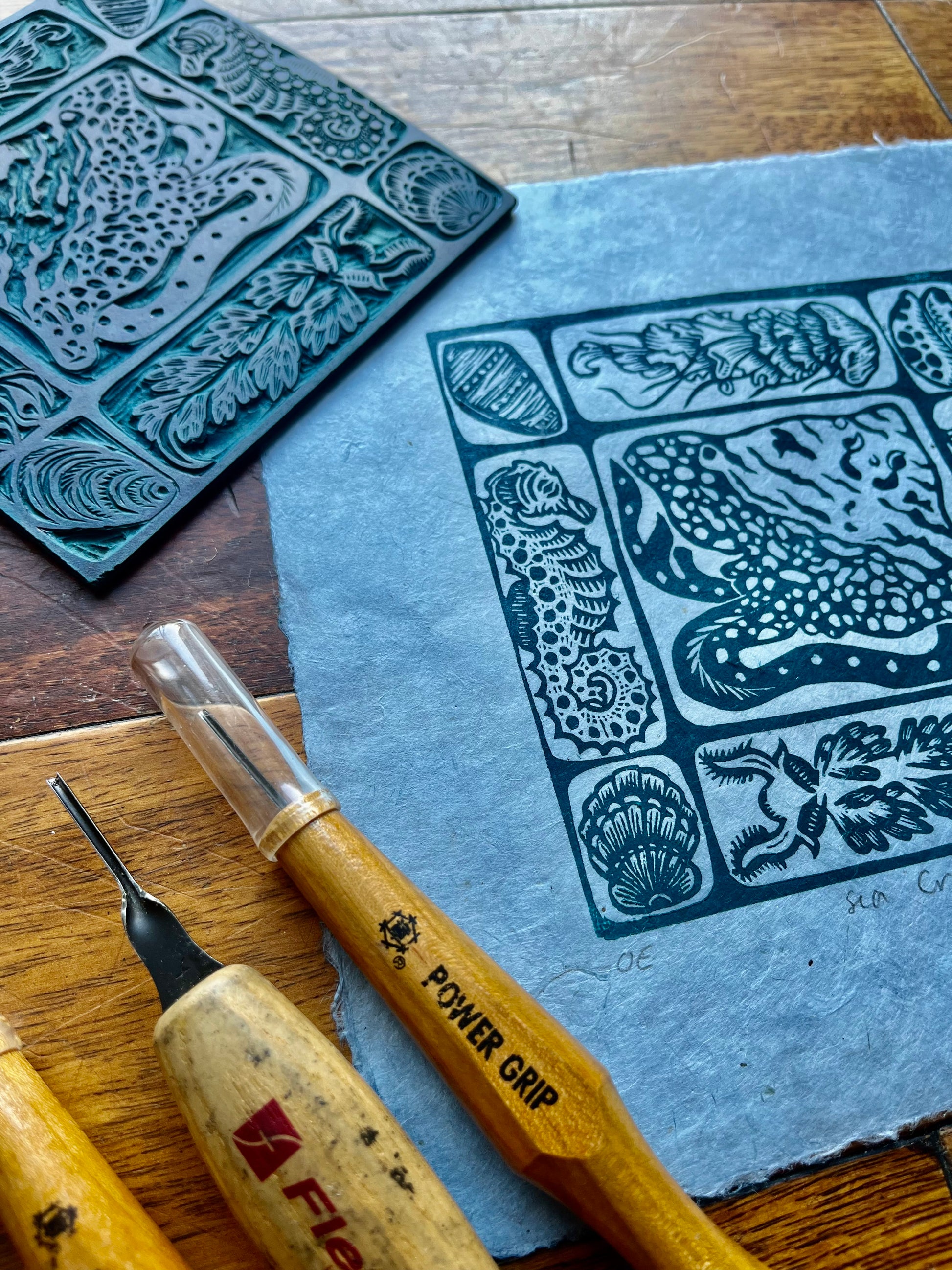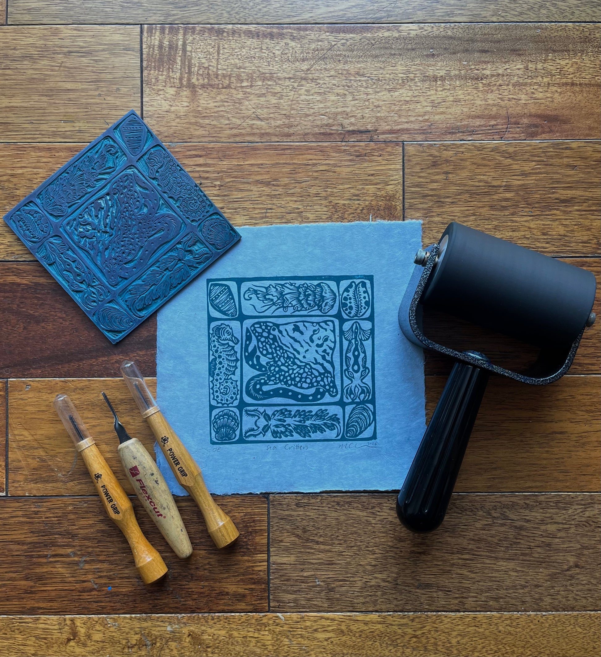 Sea Critters is a 6x6" hand-carved linoleum block print on 8x8" paper made in two variations: Teal Ink on pale blue handmade Lokta paper and teal ink on handmade slate blue mango leaf paper. These prints are in an open edition and will be reprinted as many times as the artist chooses. All prints are signed, dated, and labled "OE" for open edition.