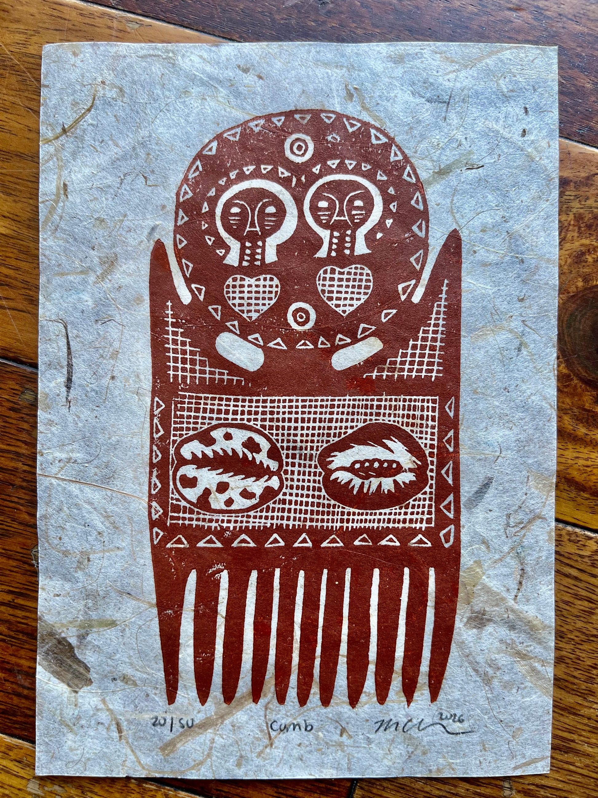 Comb is a 4x6" hand-carved linoleum block print on 5x7" hand made Thai banana leaf paper made in burnt sienna oil-based ink. This print is in a limited edition of just 50.  All prints are signed, dated, and labeled "_/50".