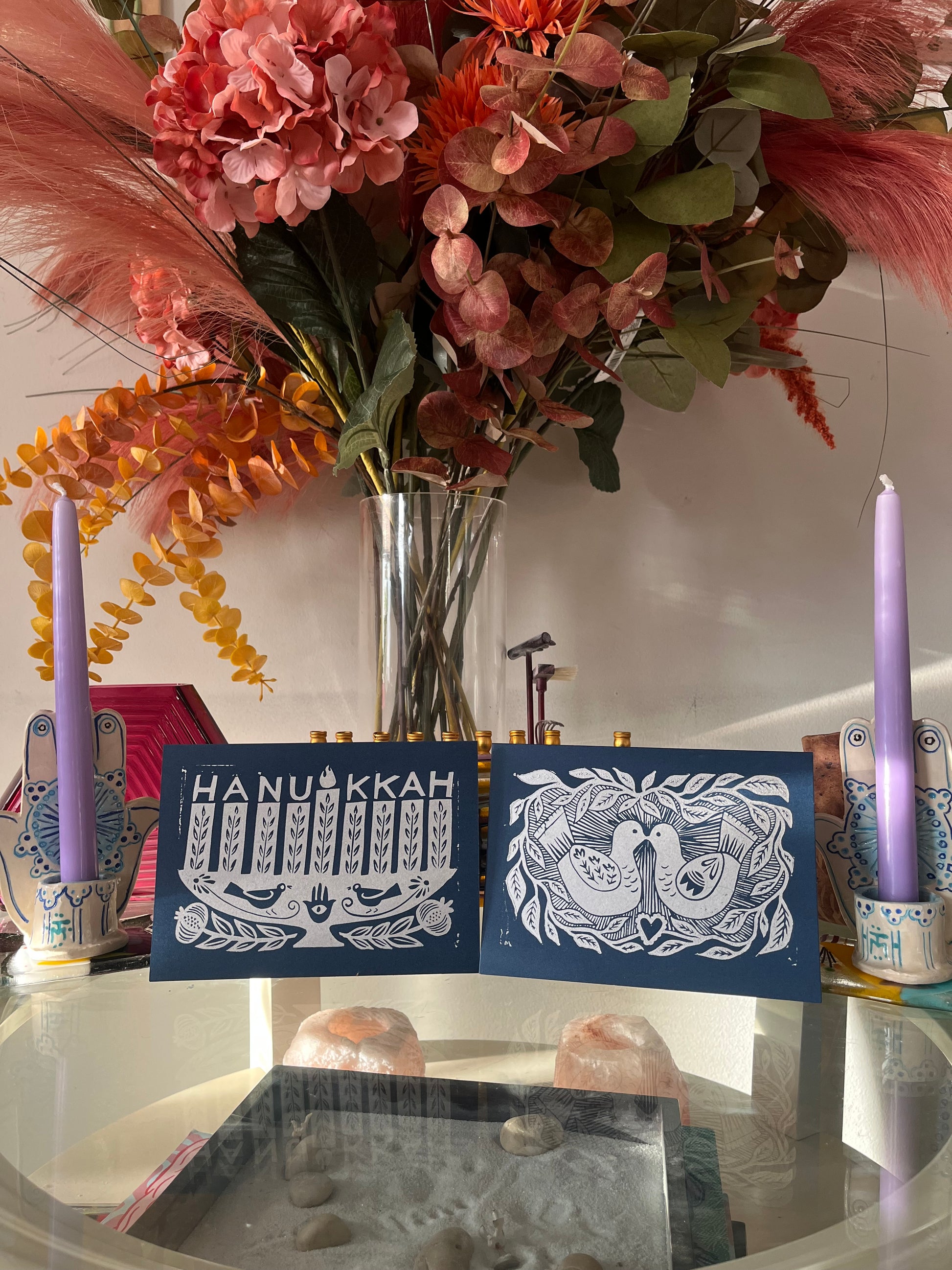 Love Doves is a hand carved linoleum block print made on 5x7” blank greeting cards made in three color variations: Gold ink on cream card, Silver ink on navy blue card, and Purple Mauve ink on cream card. All greeting cards come with a matching envelope and a gold sticker for closure.